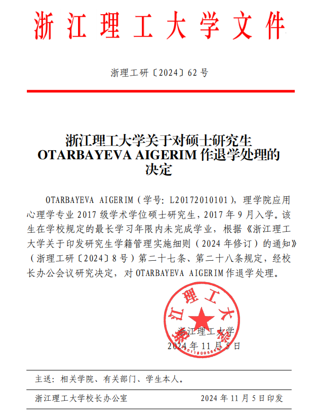 VSport体育关于对硕士研究生OTARBAYEVA AIGERIM作退学处理的决定