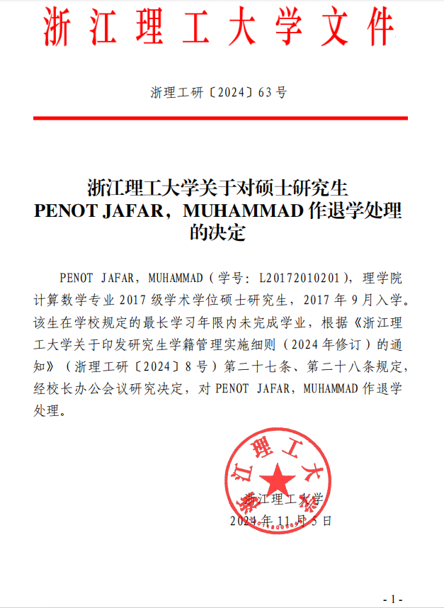 VSport体育关于对硕士研究生PENOT JAFAR,MUHAMMAD作退学处理的决定