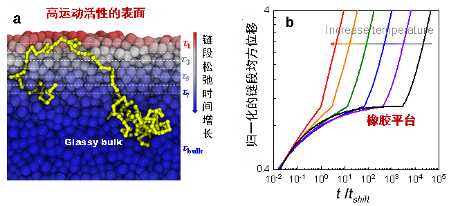 b.低于缠结分子量聚合物表面链段均方位移与时间的依赖关系。从图b可见,温度较低时,非缠结高分子表面出现橡胶平台。
