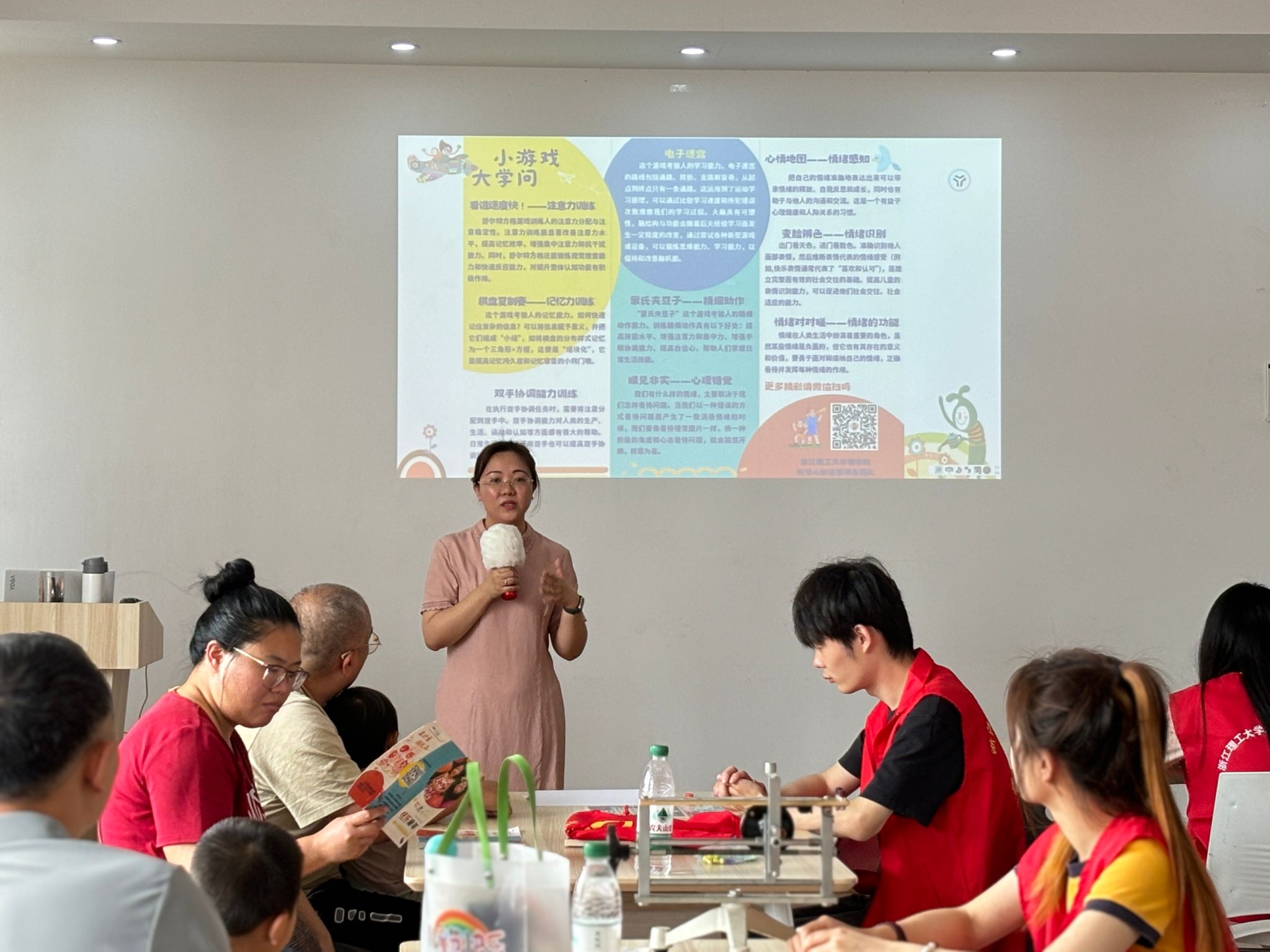 活动伊始,甘甜老师为大家深入浅出地阐述了活动的目的、流程以及各个游园项目蕴含的科学原理。本次游园会期望能充分发挥心理学的实践价值,借助一系列精心策划的专业训练项目与互动体验环节,为教职工们提供实用的方法与灵感,助力他们在家庭中营造出更加温馨、和谐且富有支持性的教育环境,让心理学的智慧在家庭生活中落地生根,为孩子们的健康成长保驾护航。
