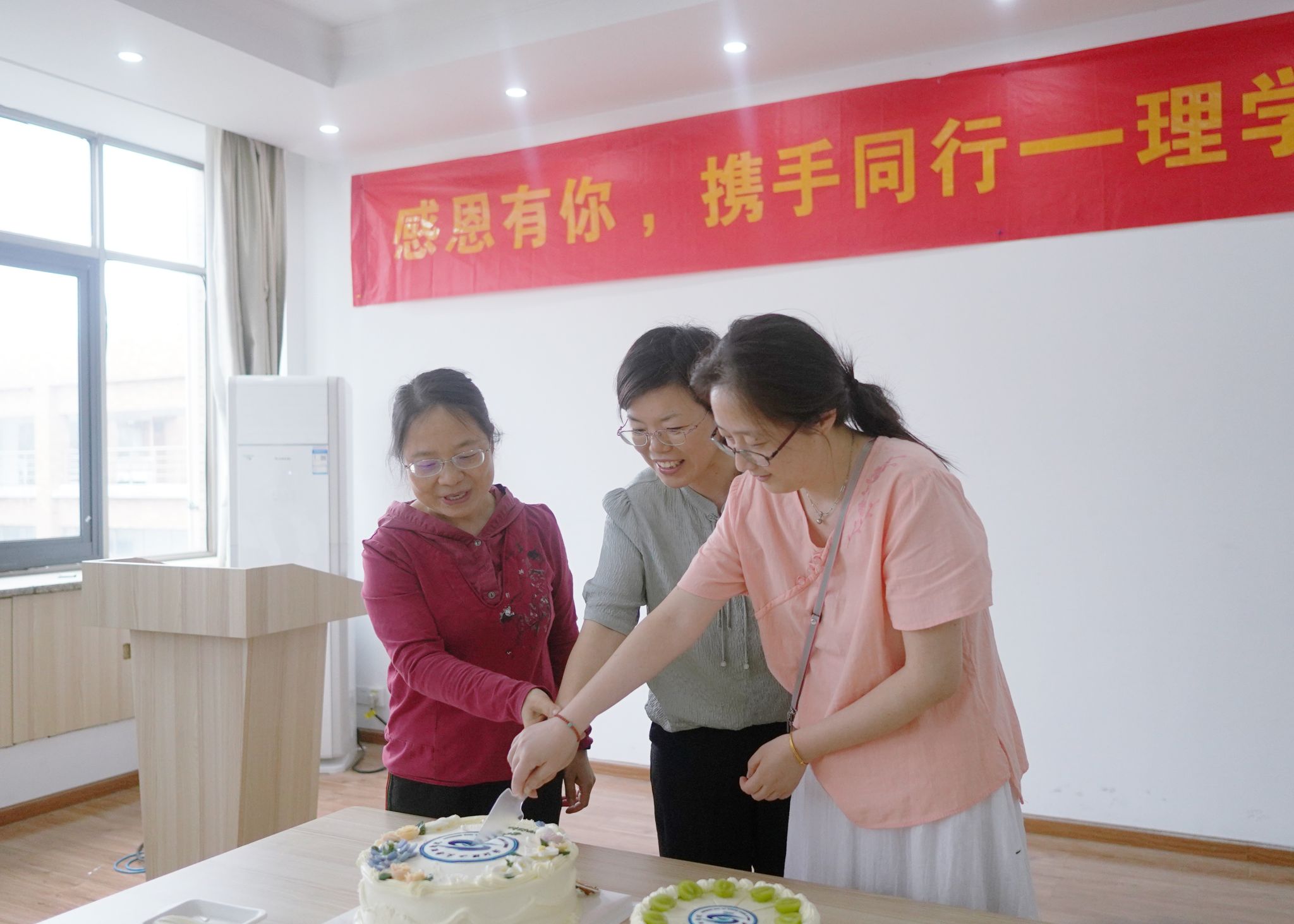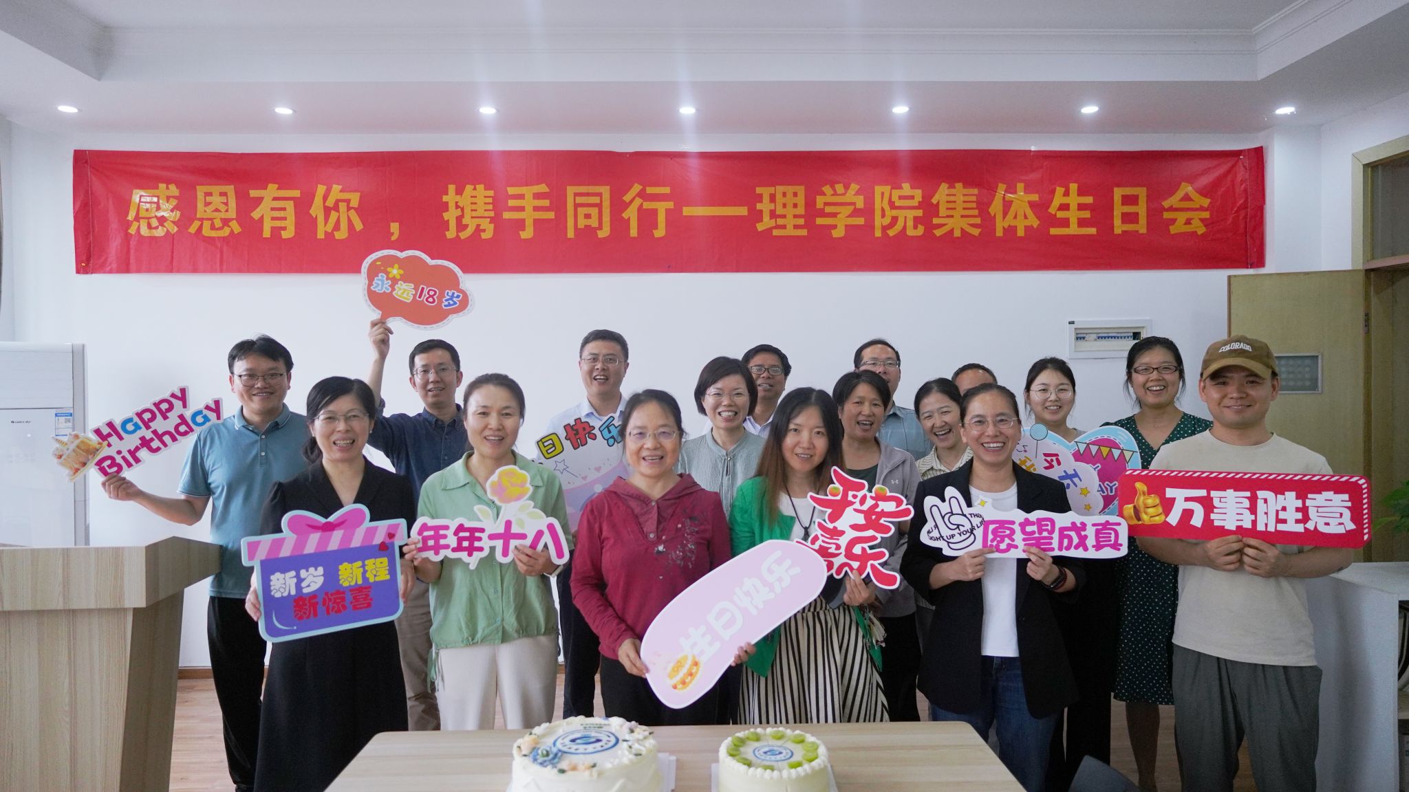 活动当天,恰逢数学科学系韩维老师生日,老师们共唱生日快乐歌,现场洋溢着欢乐与温馨。伴随着欢声笑语和祝福的歌声,寿星们共同许下心愿,切开特别订做、印有公司院徽的生日蛋糕,与在场的同事们分享甜蜜。