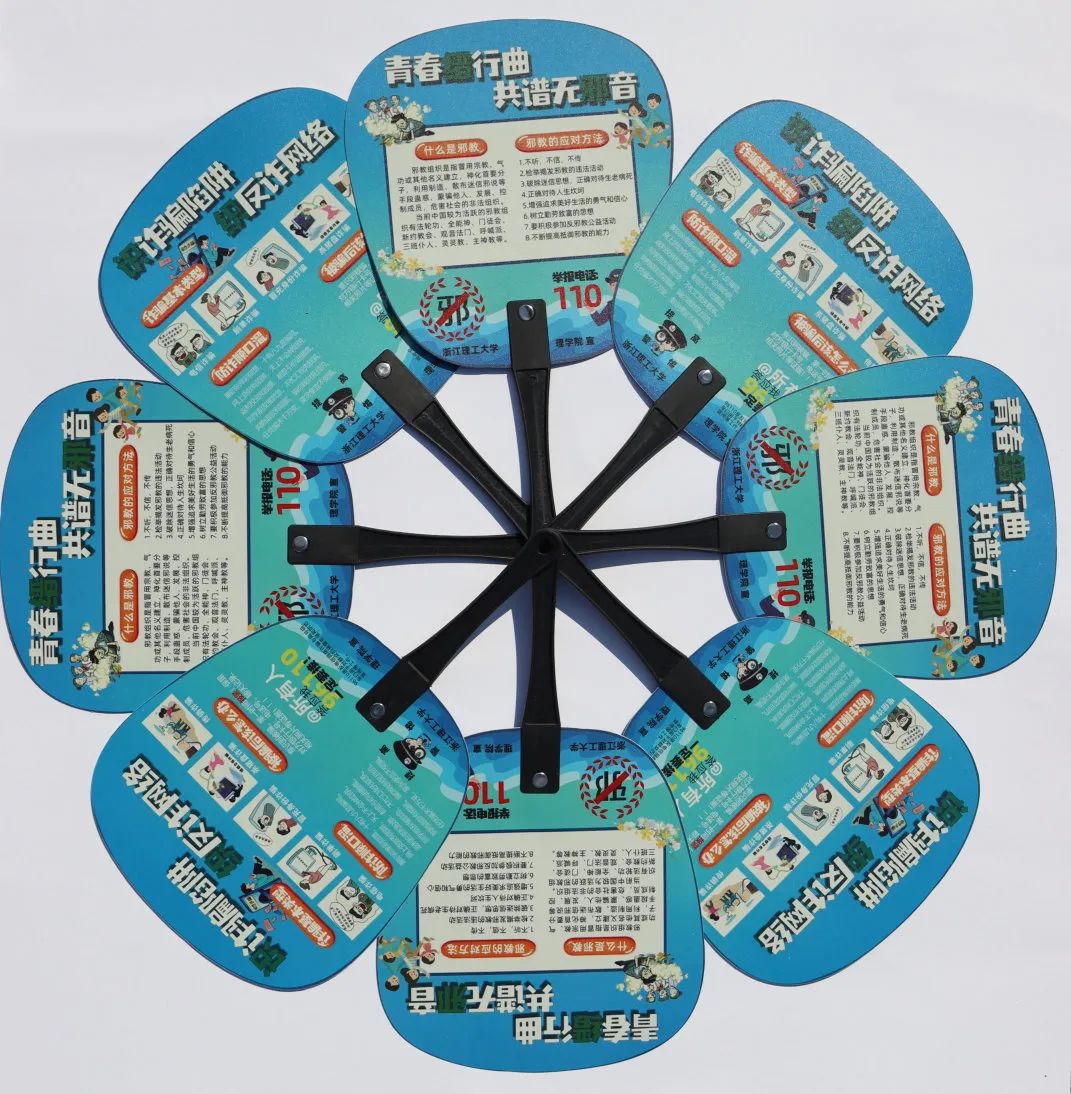 实践团自主设计并制作反邪防诈“文创周边”,通过一支实用便携小凉扇、两本干货满满宣传册、三个趣味科普宣传片、六幅通俗易懂海报画,以生动形象、喜闻乐见的宣传媒介让反邪防诈知识走入千家万户。