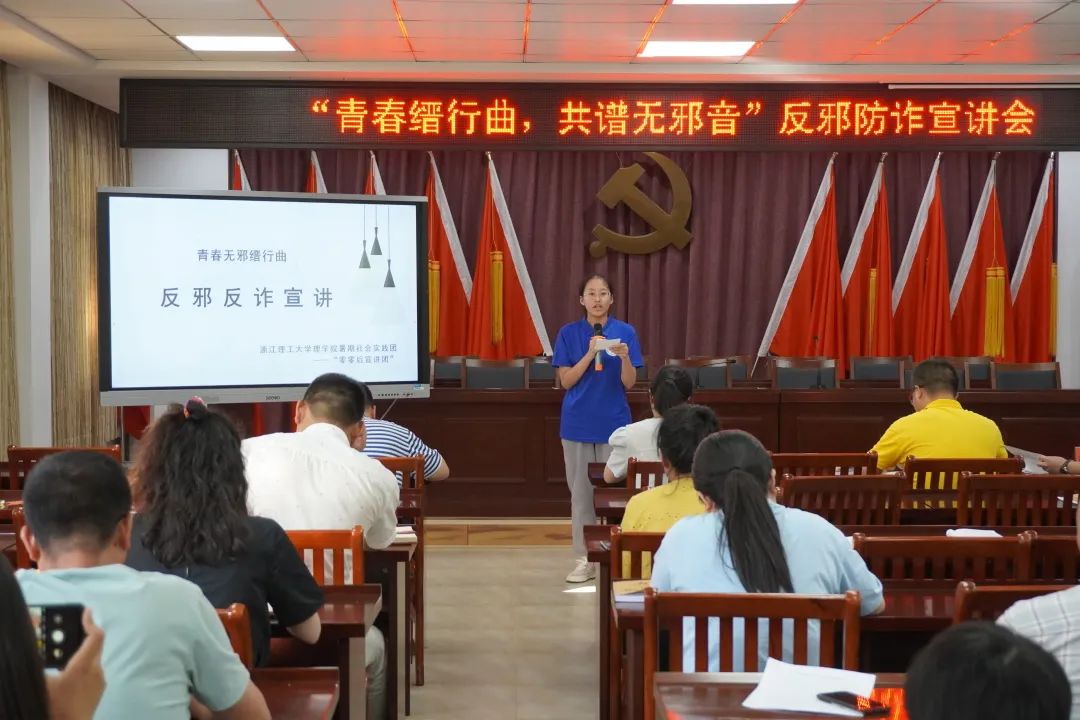 实践团联合当地基层宣传力量,充分发挥团队专业及特长,多方调研邪教诈骗问题现状,全面探寻反邪防诈治理锦囊,通过趣味生动的宣传形式送反邪防诈知识进乡村、进家庭、进校园,打出一套“反邪防诈组合拳”,为平安浙江建设贡献青春力量。