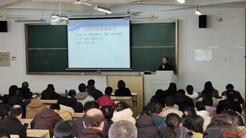 在会议的第三阶段,保卫处消防科科长李赞颂老师受邀为全体师生进行了消防安全知识宣讲,并组织师生赴室外开展了消防演练。
