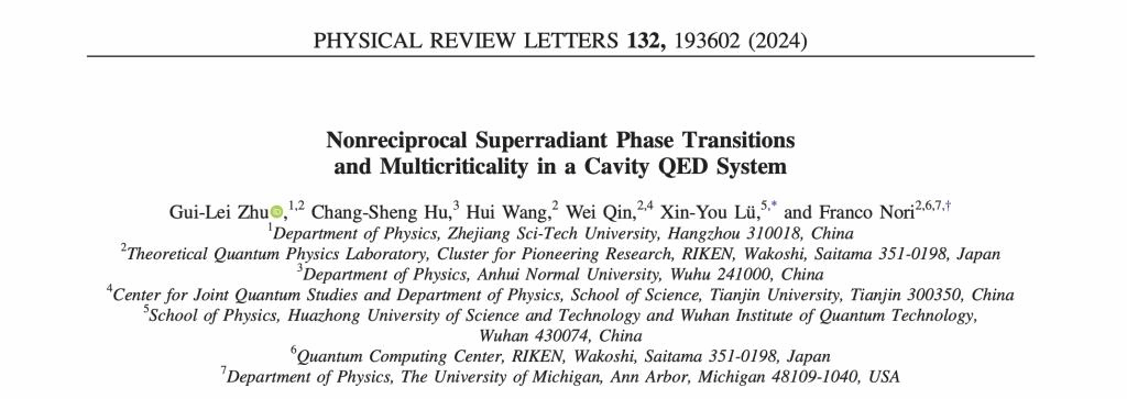 近日,公司VSport体育青年教师朱贵蕾博士在国际物理学顶级期刊Physical Review Letters发表了题为“Nonreciprocal Superradiant Phase Transitions and Multicriticality in a Cavity QED System” 的研究论文。朱贵蕾博士是论文的第一作者,VSport体育为第一署名单位,华中科技大学的吕新友教授和日本理化学研究所的Franco Nori教授为共同通讯作者。该工作受到科技部国家重点研发计划(2021YFA1400700)的资助。