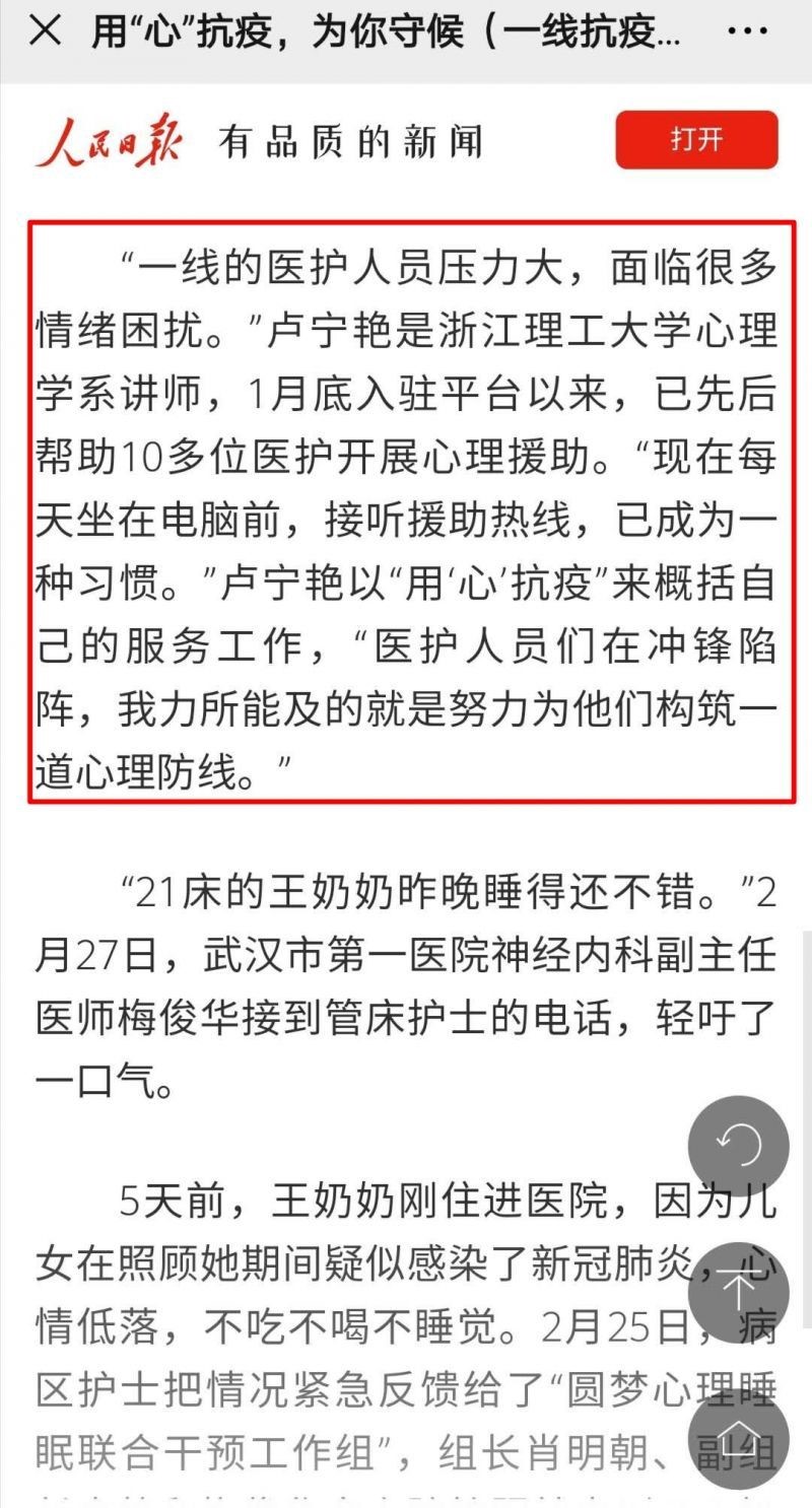 卢宁艳老师心理抗疫事迹获人民日报报道