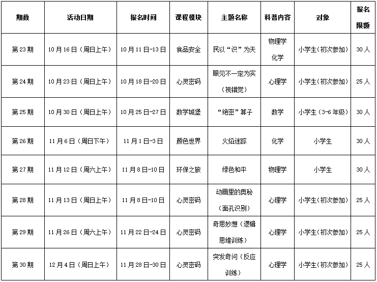 2016年10月-12月期间将举办第23-30期青少年科普训练营,招募第二期“小小科技家”及中小员工科普志愿者。