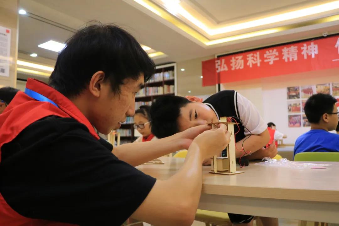 “小朋友们,你们坐过电梯吗,你们好奇电梯是如何运行的吗?”志愿者将电梯运行背后的原理详细地介绍给小朋友,小朋友们专注地盯着一张张照片,学习着其中的物理知识。“小朋友们,你们知道当坐电梯时电梯失灵,要怎么做吗?”“蹲下!”小朋友们大喊。“我们要先摁下每个楼层,并且贴紧墙壁,腿弯曲,这样能够尽量缓解电梯坠落带给我们的冲撞。”之后,志愿者教小朋友们一起做简易电梯模型。当木板变成电梯,在遥控的控制下自由升降,这带给小朋友们莫大的喜悦感。