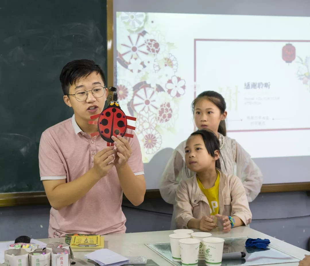 实践是检验真理的唯一标准。讲完了原理,志愿者们带领孩子们进入小制作环节。“我们没有提前讲解小制作的详细过程,我们想让孩子们积极思考,学会自己去探索。”起初,很多孩子都有些不知所措,不断询问老师如何完成小制作。后来孩子们互相帮助,最终每个小组都成功制作出了这个小小的纸瓢虫。不知不觉,活动渐入尾声,有的孩子把小瓢虫送给了自己心爱的老师,有的还在继续研究小瓢虫的原理,有的则把小瓢虫小心翼翼地放回了包里。