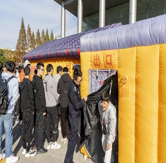 模拟演练的第二个环节是模拟火灾帐篷逃生演练(热烟环境逃生系统)。“逃生帐篷”内模拟现实火灾发生时断电、房间内充满烟雾的环境,里面走廊迂回曲折,似迷宫一般。体验活动进行时,每位同学在老师的指导下,在烟雾缭绕的帐篷内感受火灾发生时的状态,并按照“安全出口”荧光标识找到正确道路,进行“逃生”,让同学们学会“低头弯腰,掩住口鼻,快速有序”的逃生要领。